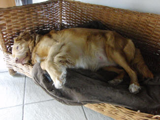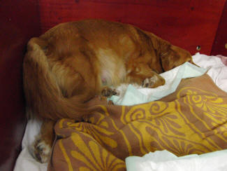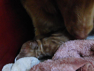 Vrijdag 8 april eet Ylva, geheel tegen haar gewoonte met lange tanden, een duidelijk teken dat er van alles aan het werk is in haar lijf. Gedurende de nacht komt Ylva een paar keer naar boven en denkt haar nest wel te kunnen gaan maken in de strijkmand met schoon wasgoed. Met zachte dwang is ze weer naar beneden gestuurd en krijgt de werpkist aangewezen. Tussendoor slaapt ze af en to nog wel, maar al met al was het een onrustige nacht. Zaterdag 9 april . Omdat Ylva de vorige dag slecht at, krijgt ze deze ochtend vers vlees als ontbijt, wat met smaak naar binnen gewerkt wordt. Helaas duurt dat niet lang, want nog geen half uur later deponeert Ylva haar maaginhoud op de keukenvloer. Ylva kan duidelijk haar draai niet vinden, wil naar buiten, naar binnen, naar de gang, in haar mand en gelukkig ook af en toe in de werpkist. Daarnaast zien we dat ze ook af en toe wat begon te hijgen. Kortom.................de bevalling is duidelijk begonnen.