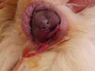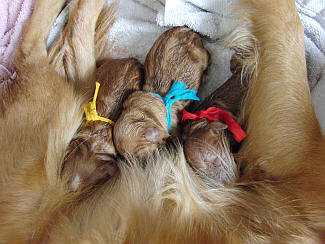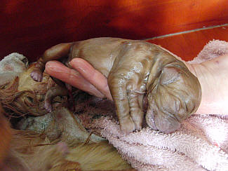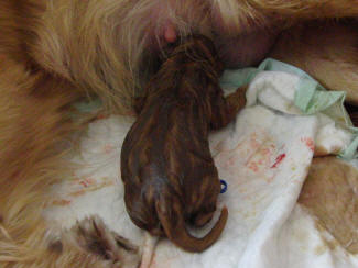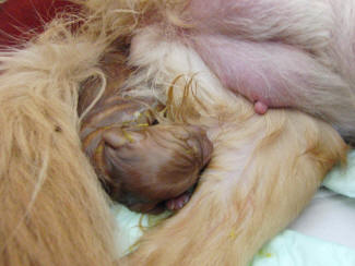 17.40 uur Ylva perst weer met oerkracht en één minuut later wordt geheel in het vlies de tweede pup geboren. Nog voor Ylva de navelstreng door kan bijten, heeft deze pup al een tepel te pakken. Het is een teefje van 405 gr. Ze heeft een flinke witte bles, witte borst en buik, 4 witte sokjes en een flinke witte punt aan de staart. Ze krijgt het gele bandje.