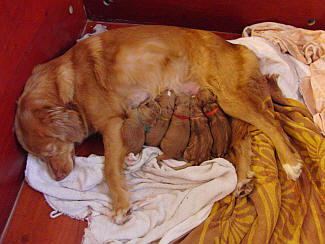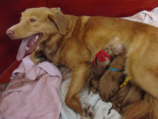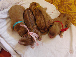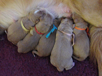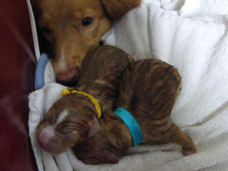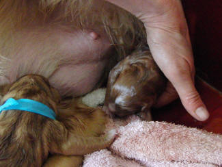 18.37 uur Er wordt weer een teefje geboren. Ze heeft net als de als tweede geboren pup een mooie grote witte bles, buik, sokken en staartpunt. Haar gewicht is 401 gr en ze krijgt een roze bandje om. Ook dit teefje is gelijk actief op zoek naar een tepel.