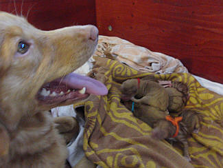 Ylva komt nu echt meer tot rust. Met een laatste perswee wordt een uur later nog een nageboorte geboren. Ze is dan al volop in haar moederrol en verzorgt haar pups alsof ze nooit anders gedaan heeft
